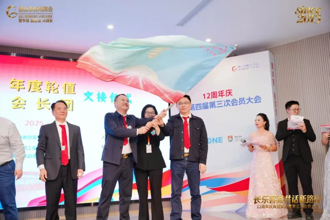 在全体会员的共同见证下,商会举行了隆重的轮值会长交接仪式,2026年度轮值会长团张思中(人信工程董事长)、黄芳(易德猎头董事长)、邓胜锦(帝栢家具董事长)接过会旗,振臂挥舞旗帜,气势如虹!