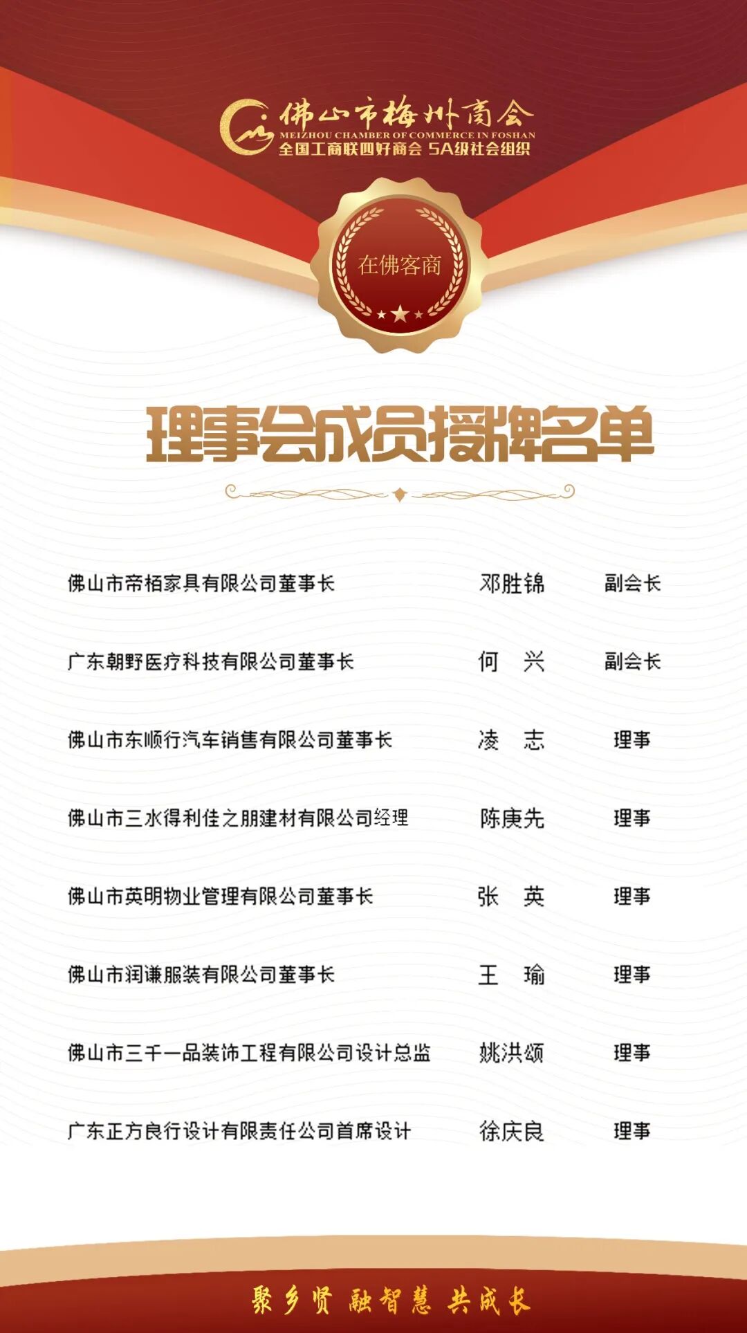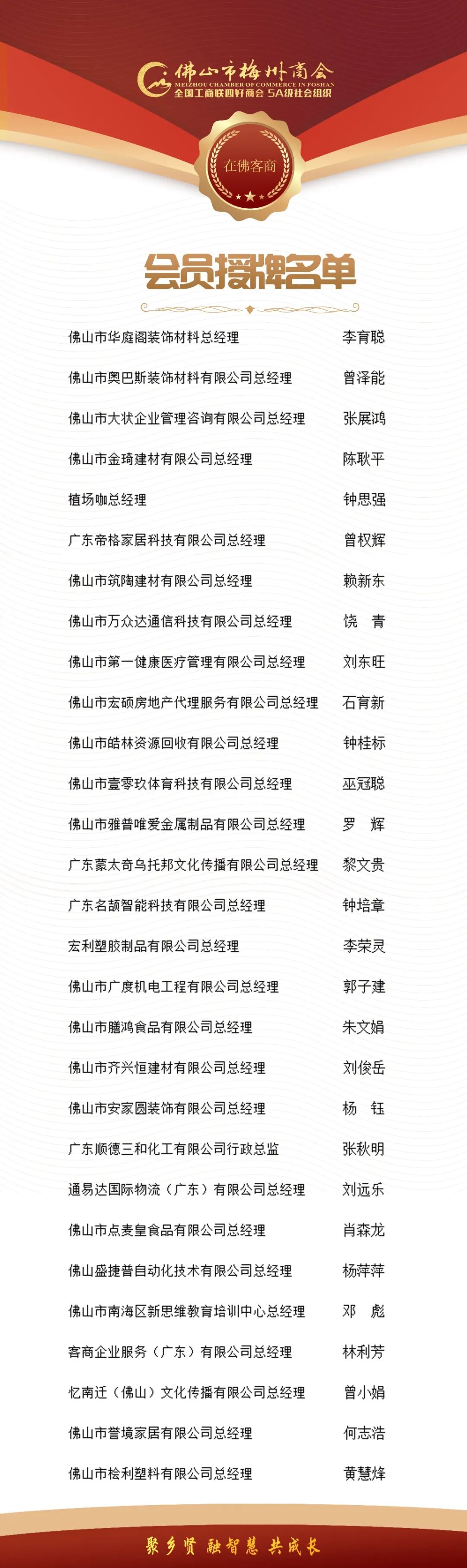 会员是商会的根基,越来越多来自各行各业的优秀企业选择加入商会这个大家庭,往届在册会员也回到商会大家庭。这既是对我们过往工作的肯定,也是对我们未来发展的鞭策。商会将继续秉持“聚乡贤 融智慧 共成长”的宗旨,为会员提供更精准、更高效的服务,搭建一个资源共享、优势互补、合作共赢的坚实平台。