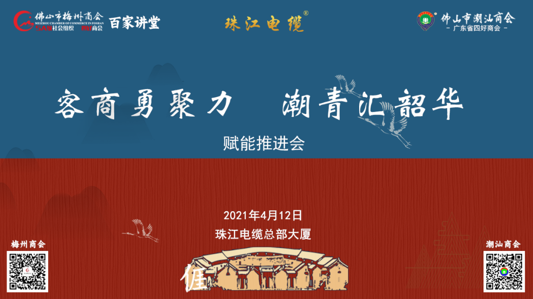 2021年4月12日,佛山市梅州商会与佛山市潮汕商会联合主办的百家讲堂【客商勇聚力,潮青汇韶华】赋能推进会在佛山市梅州商会常务副会长李秉彰企业珠江电缆总部大楼顺利举行。