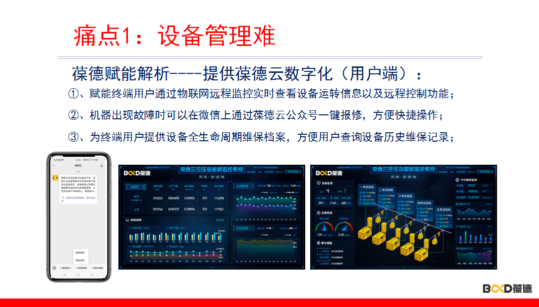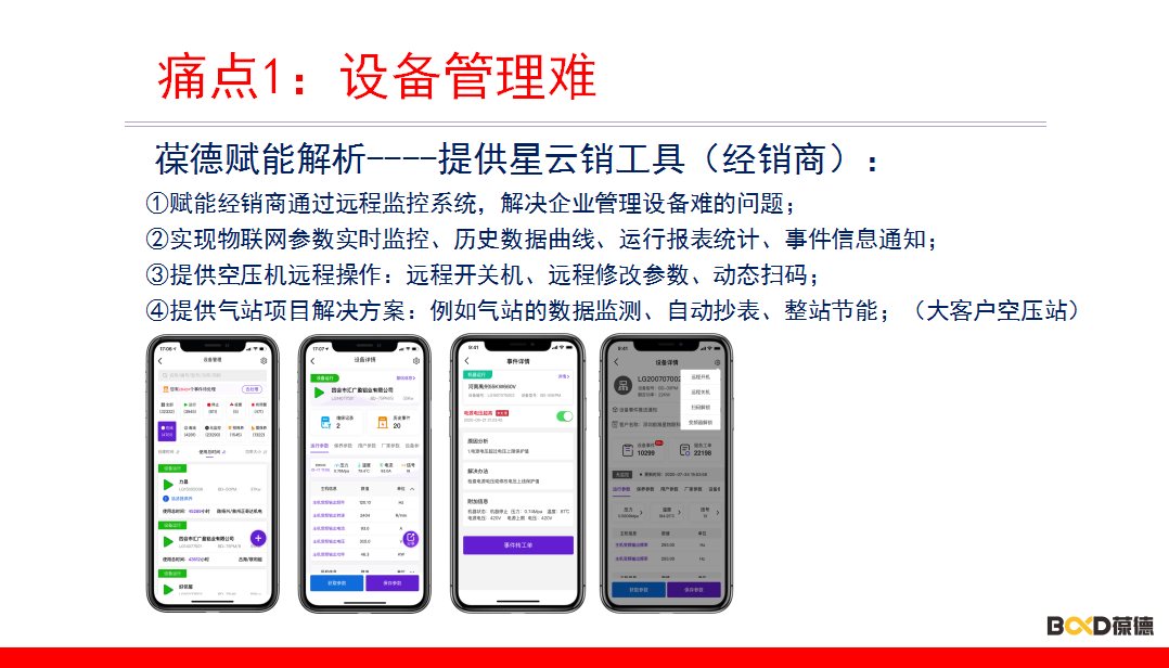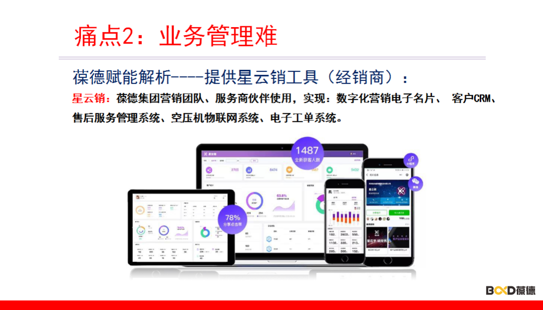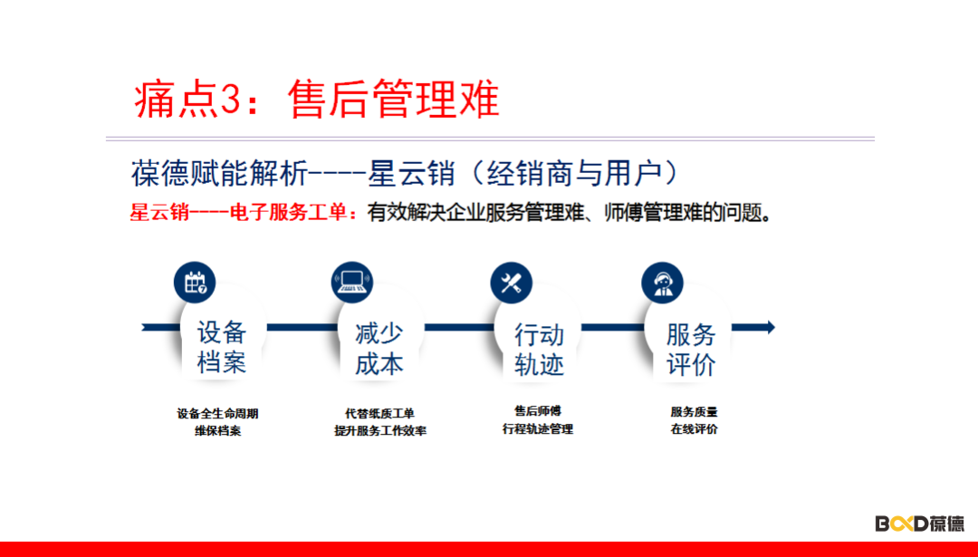 2.数字化运维为经销商赋能,为经销商提供优越的市场政策、超省心加盟、无忧式协助的同时,帮助经销商进行企业内部调研分析、企业组织架构梳理为经销商量身定制的数字化管理方案。解决企业设备管理难、业务管理难、售后管理难的问题。