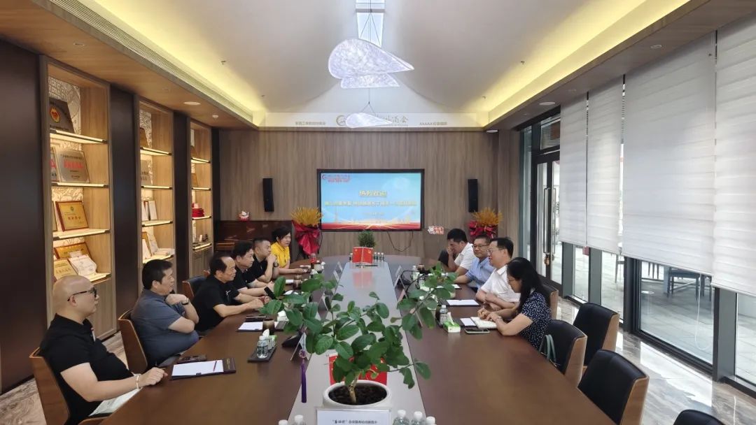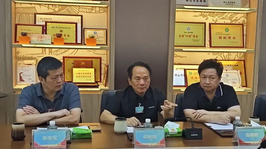 商会会长、广东东鹏控股股份有限公司董事长何新明,商会执行会长兼年度轮值会长、佛山市颖林教育集团执行董事长张俊宝,商会监事长、广东吉熙安电缆附件有限公司 董事长陈朝晖,商会副会长兼年度轮值会长、广东粮心优品集团有限公司董事长刘剑华,商会副会长、广东智科电子股份有限公司董事长李百尧 以及秘书处参加接待。